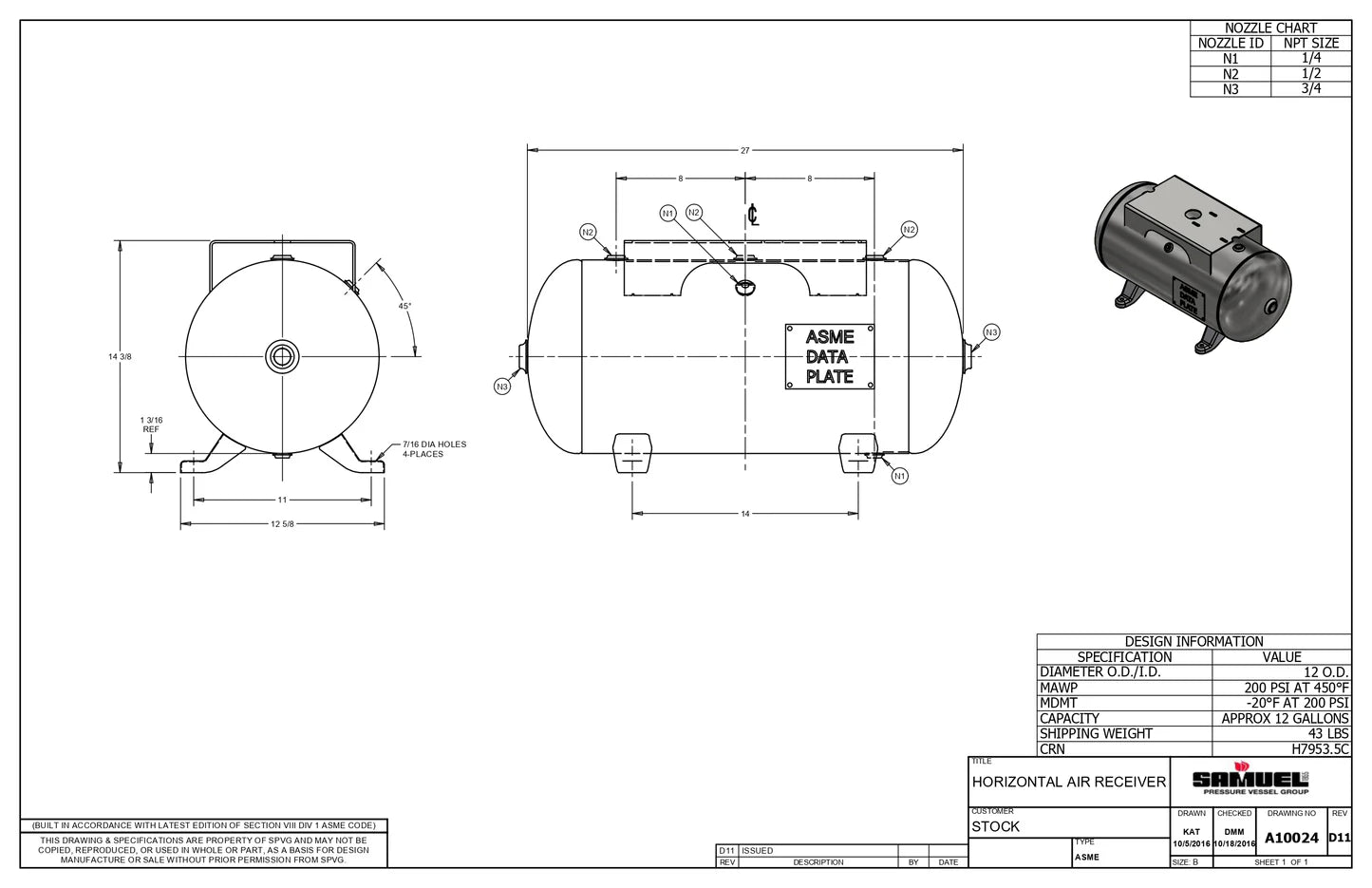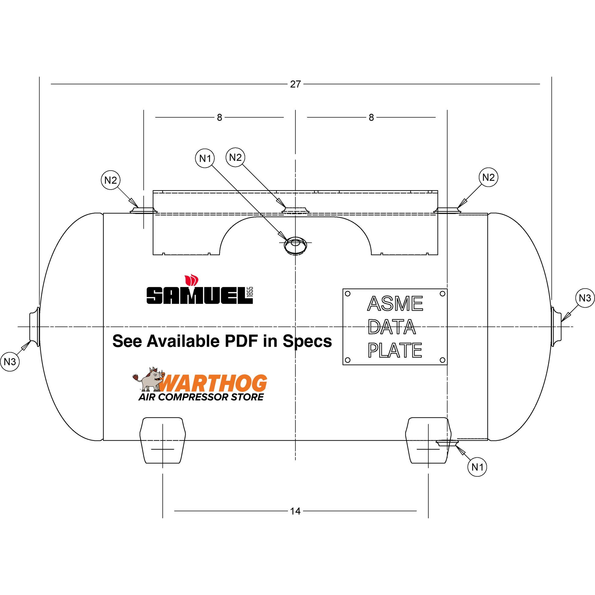 12 Gallon 200PSI Horizontal Air Tank By Samuel with Feet, 9" X 15" top plate | A10024