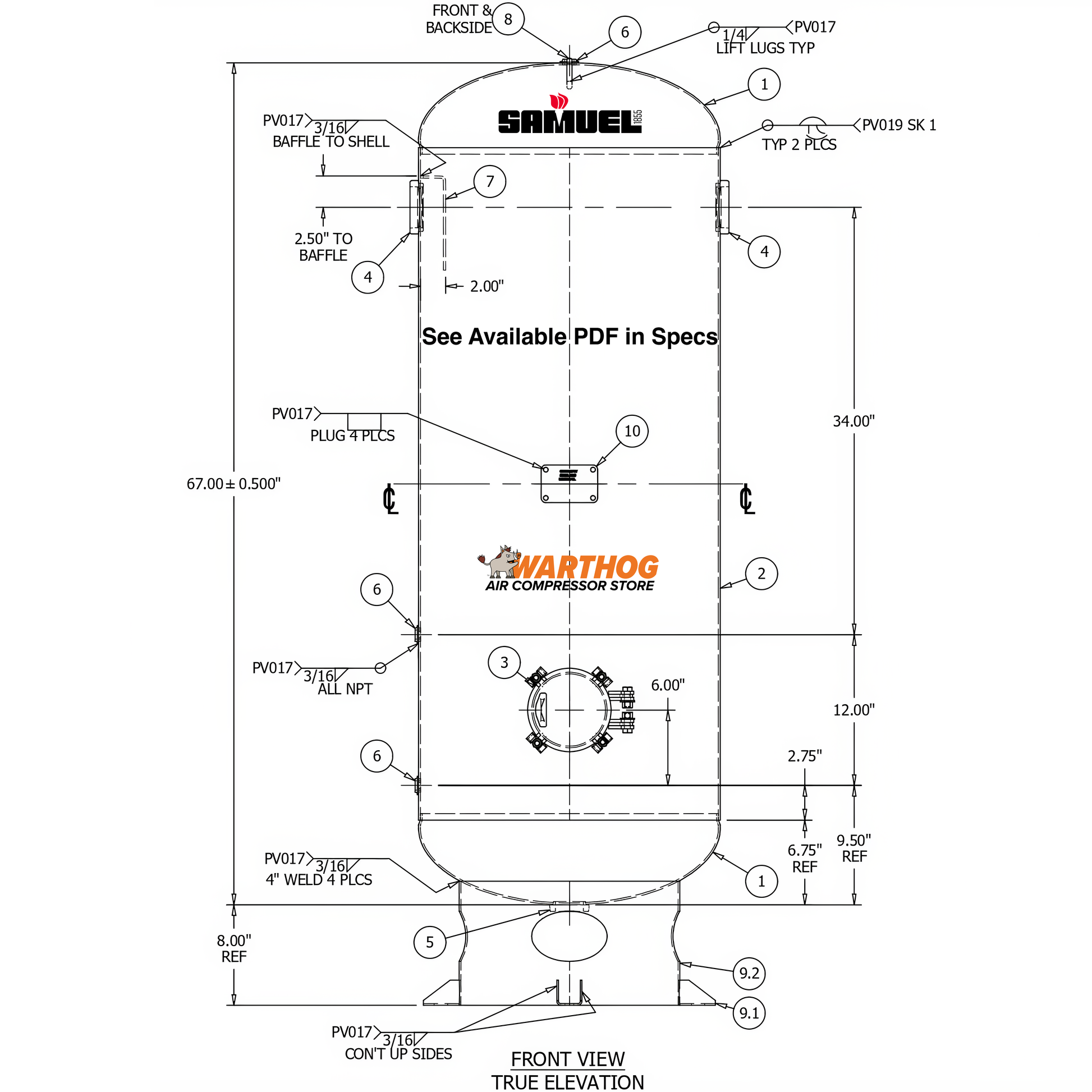 120 Gallon 150PSI Vertical Air Tank By Samuel with 8" basering / 6" hinged closure - Vacuum Rated | V10097