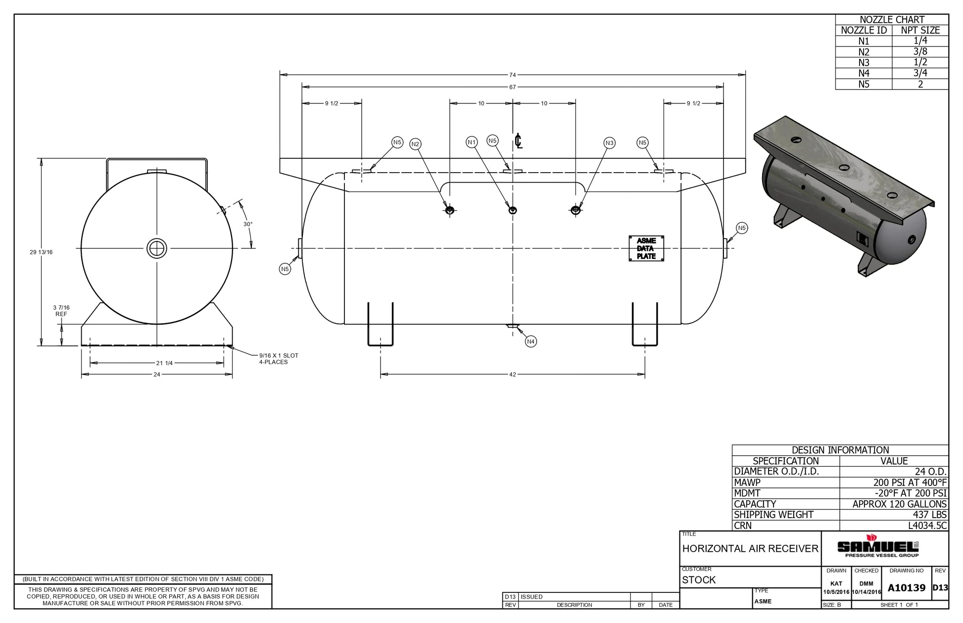 120 Gallon 200PSI Horizontal Air Tank By Samuel with Saddle legs, 16"X74" extended top plate | A10139