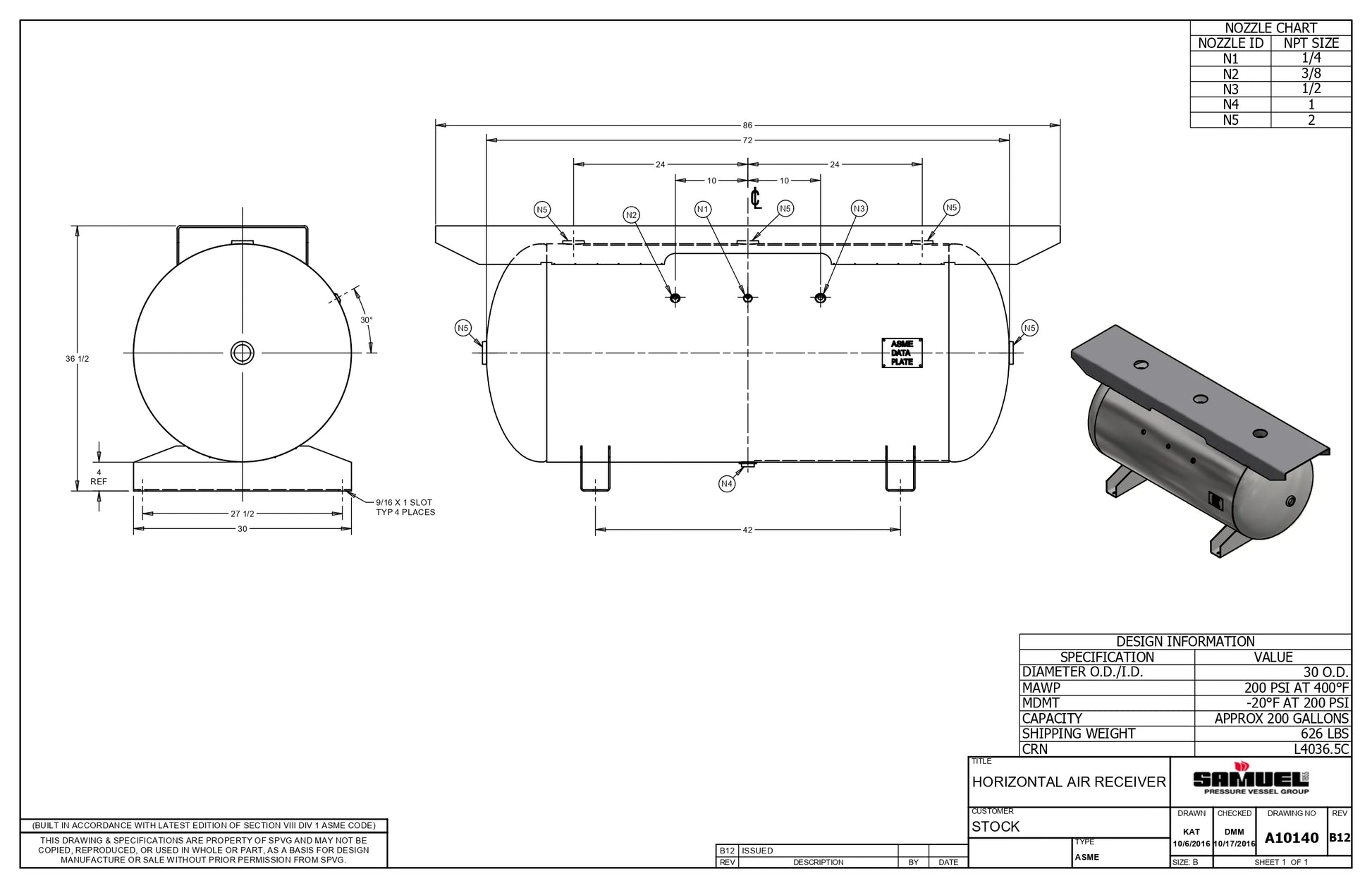 200 Gallon 200PSI Horizontal Air Tank By Samuel with Saddle legs, 18"X86" top plate | A10140