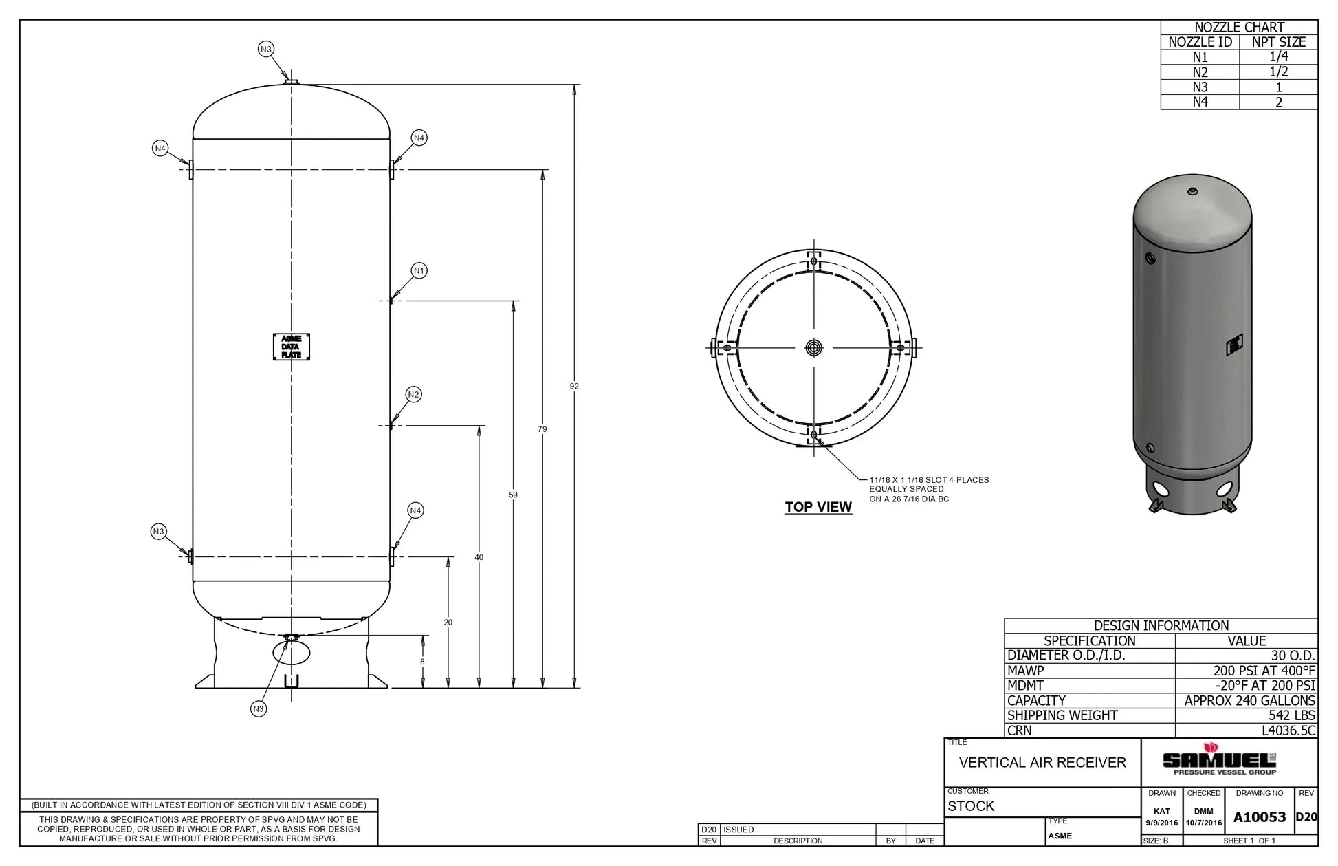 240 Gallon 200PSI Vertical Air Tank By Samuel with 8" base ring - A10053