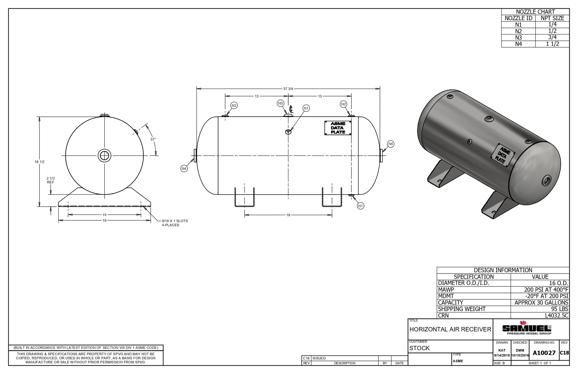 30 Gallon 200PSI Horizontal Air Tank By Samuel with Saddle legs