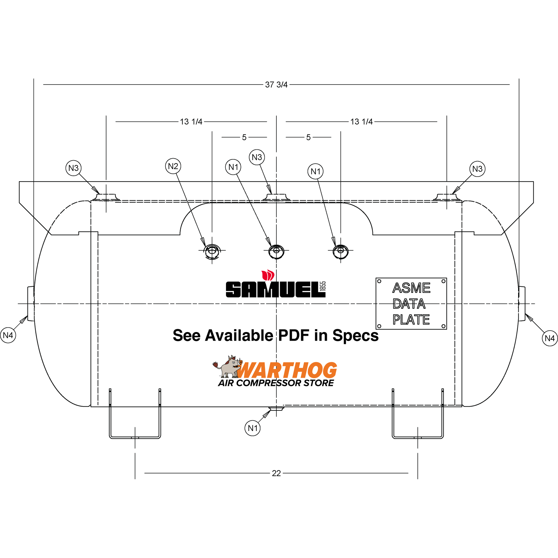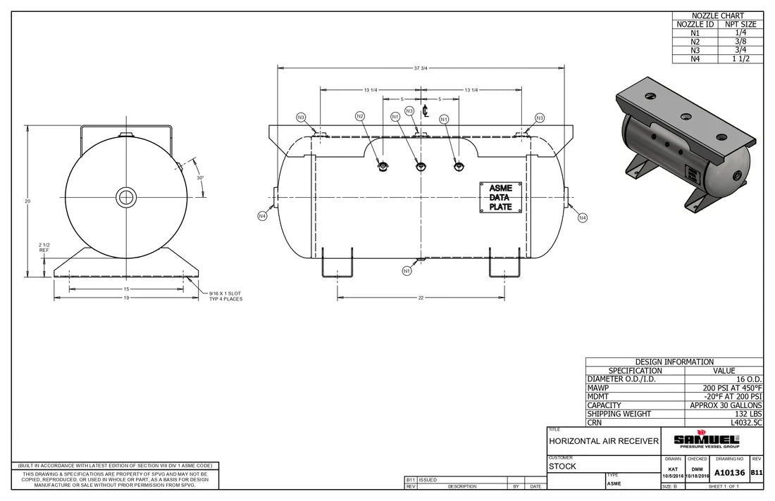 30 Gallon 200PSI Horizontal Air Tank By Samuel with Saddle legs, 12"X40" extended top plate | A10136