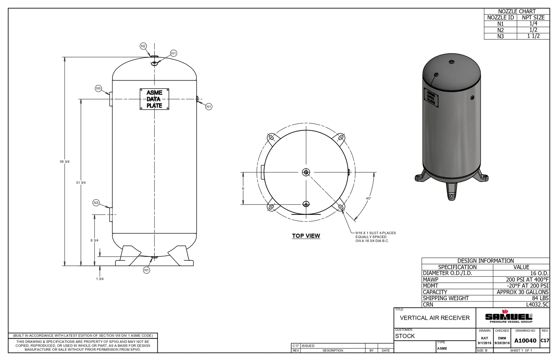 30 Gallon 200PSI Vertical Air Tank By Samuel with 4 feet | A10040