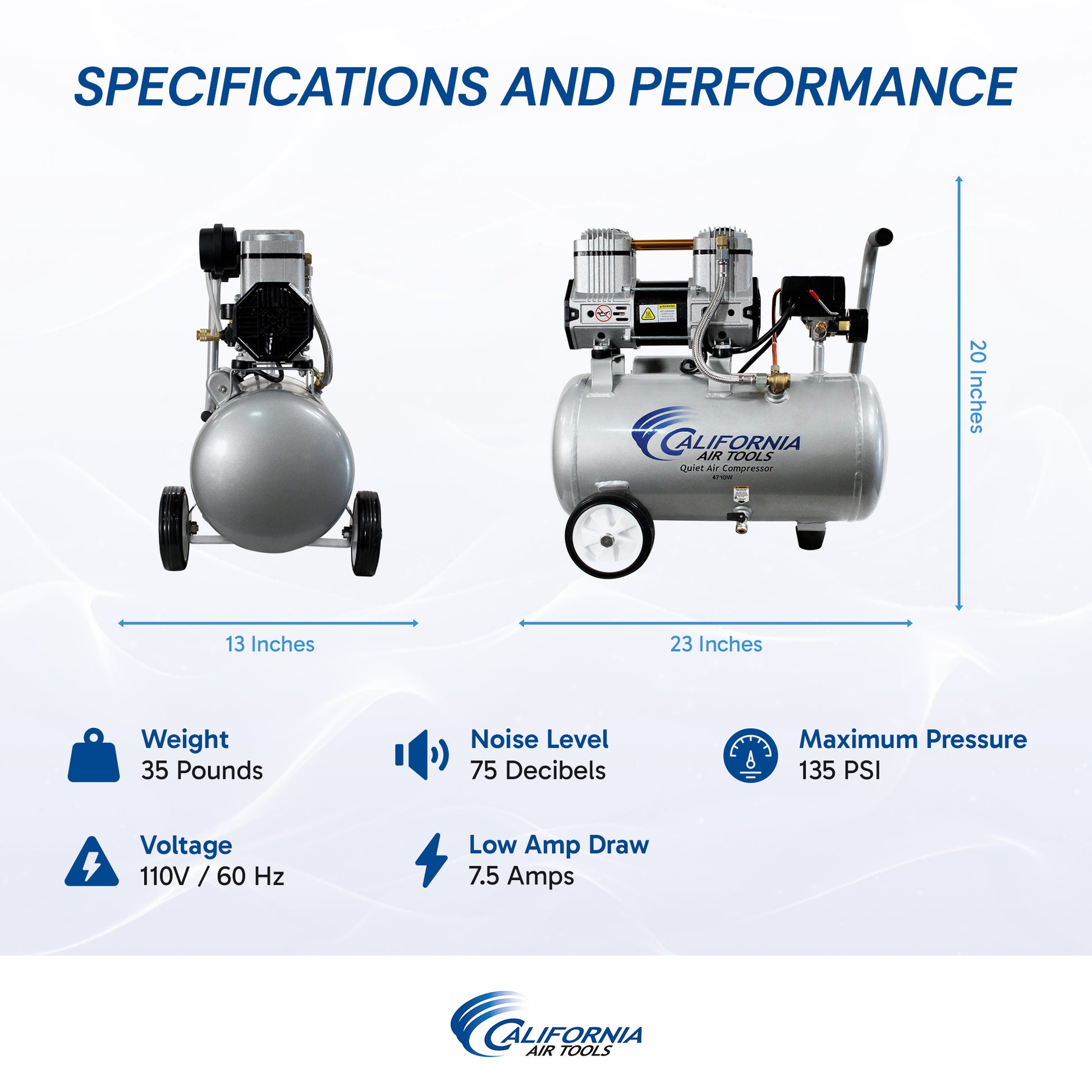 The California Air Tools 4710W Air Compressor is ideal for DIY, small businesses, and homeowners. It features an efficient, oil-free dual piston pump system designed for performance, durability, and a lifespan of over 1000 hours.
