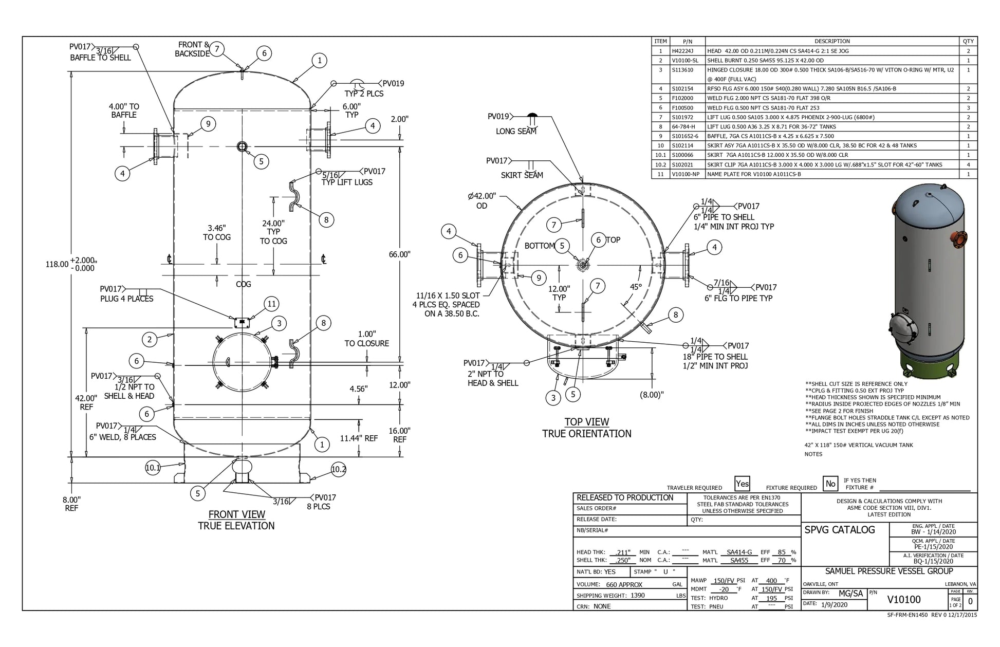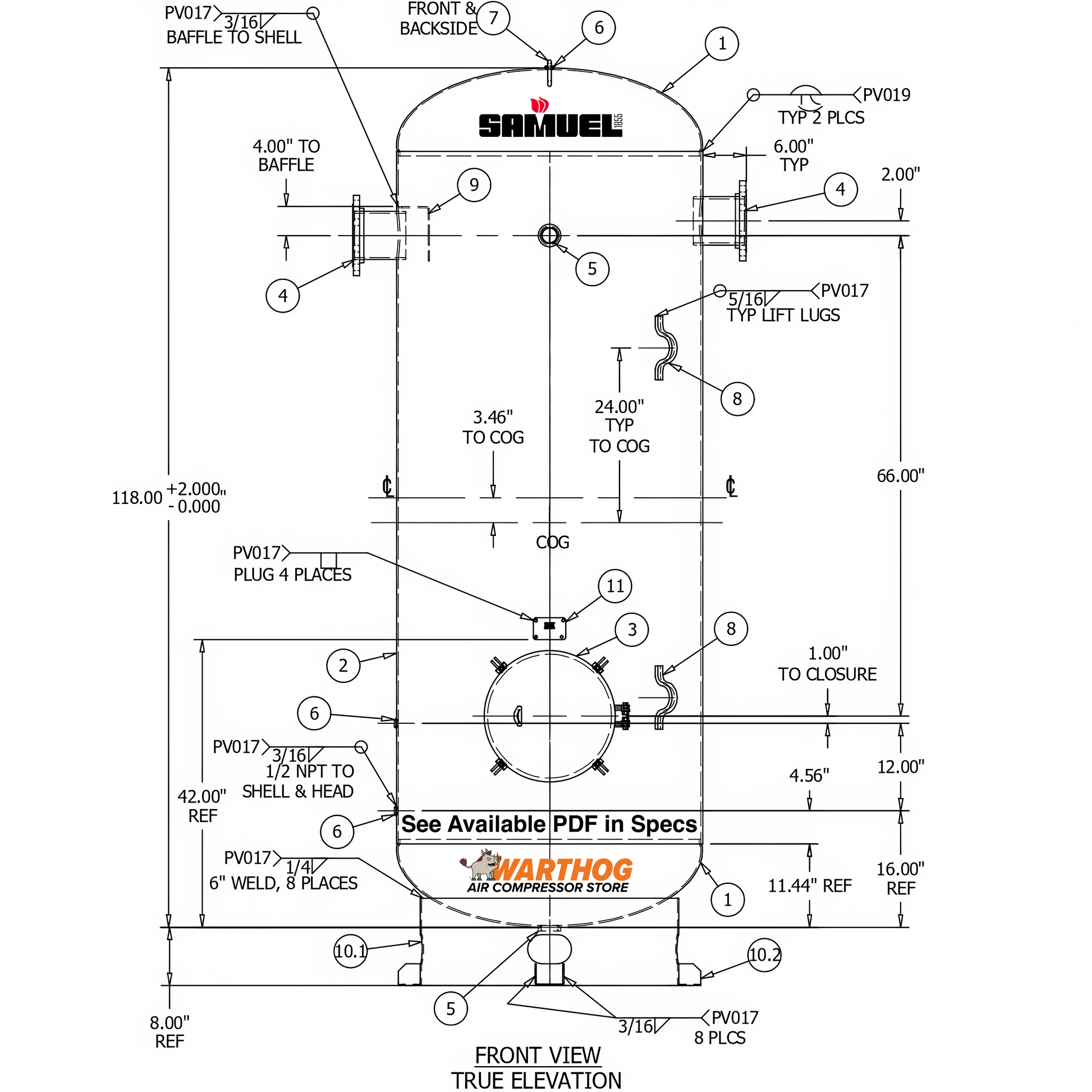 660 Gallon 150PSI Vertical Air Tank By Samuel with 8" basering / 18" hinged closure | V10100