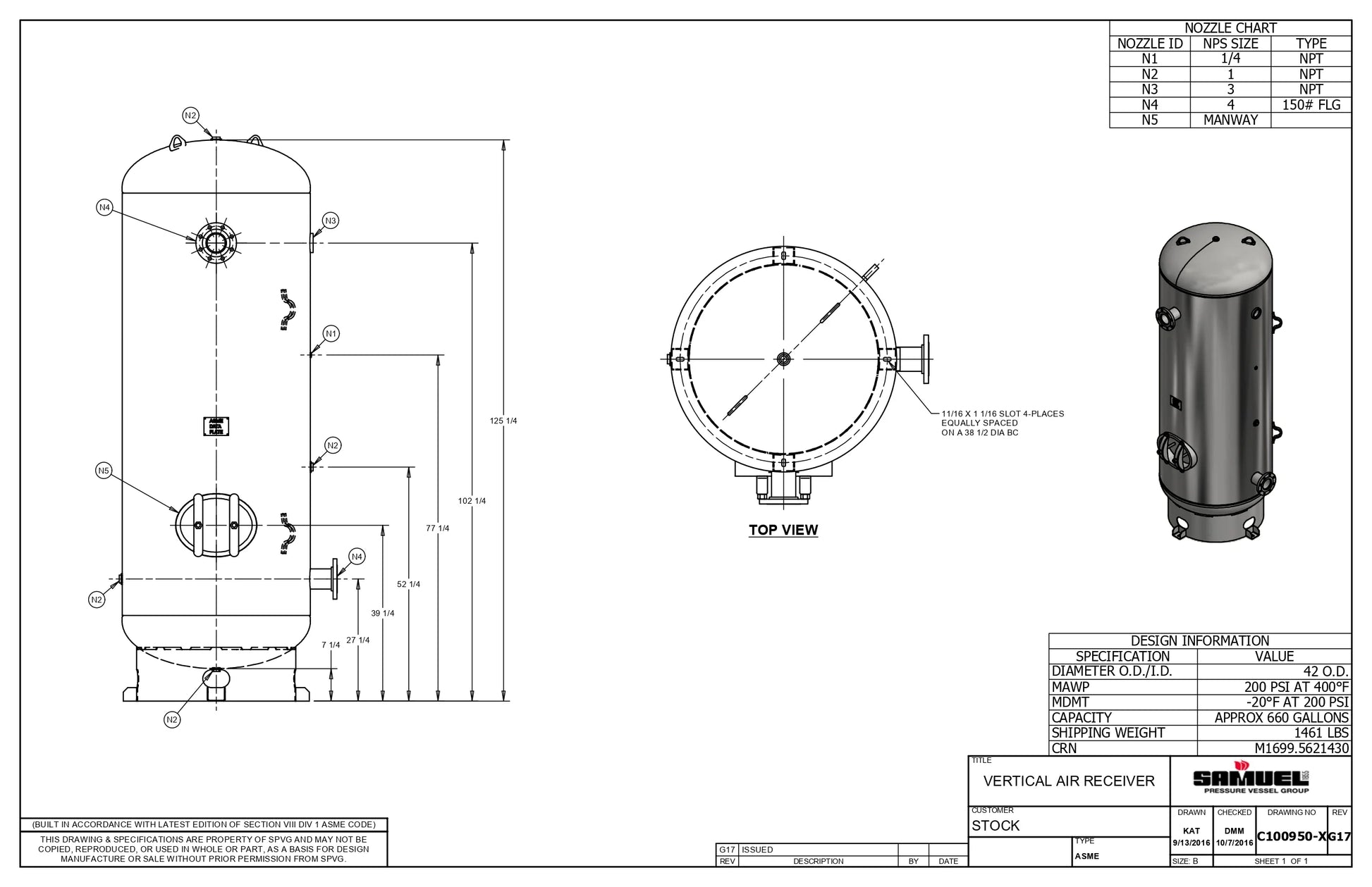 660 Gallon 200PSI Vertical Air Tank By Samuel with 8" base ring | C100950-X