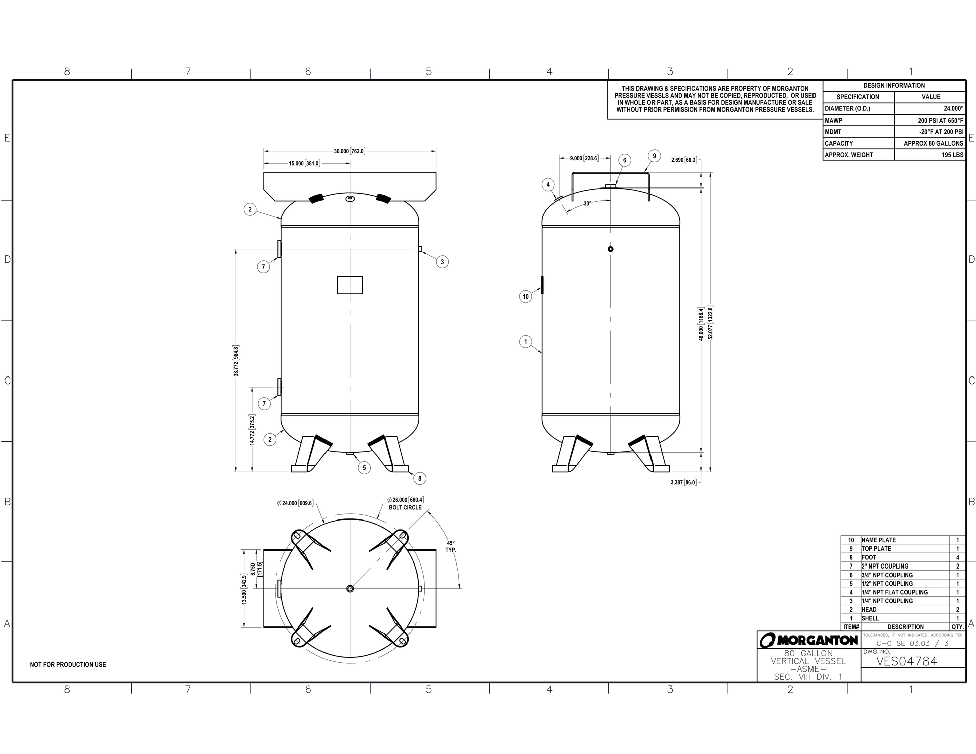 80 Gallon 200 PSI Vertical Air Tank with Feet+Top plate by Morganton | VES04784