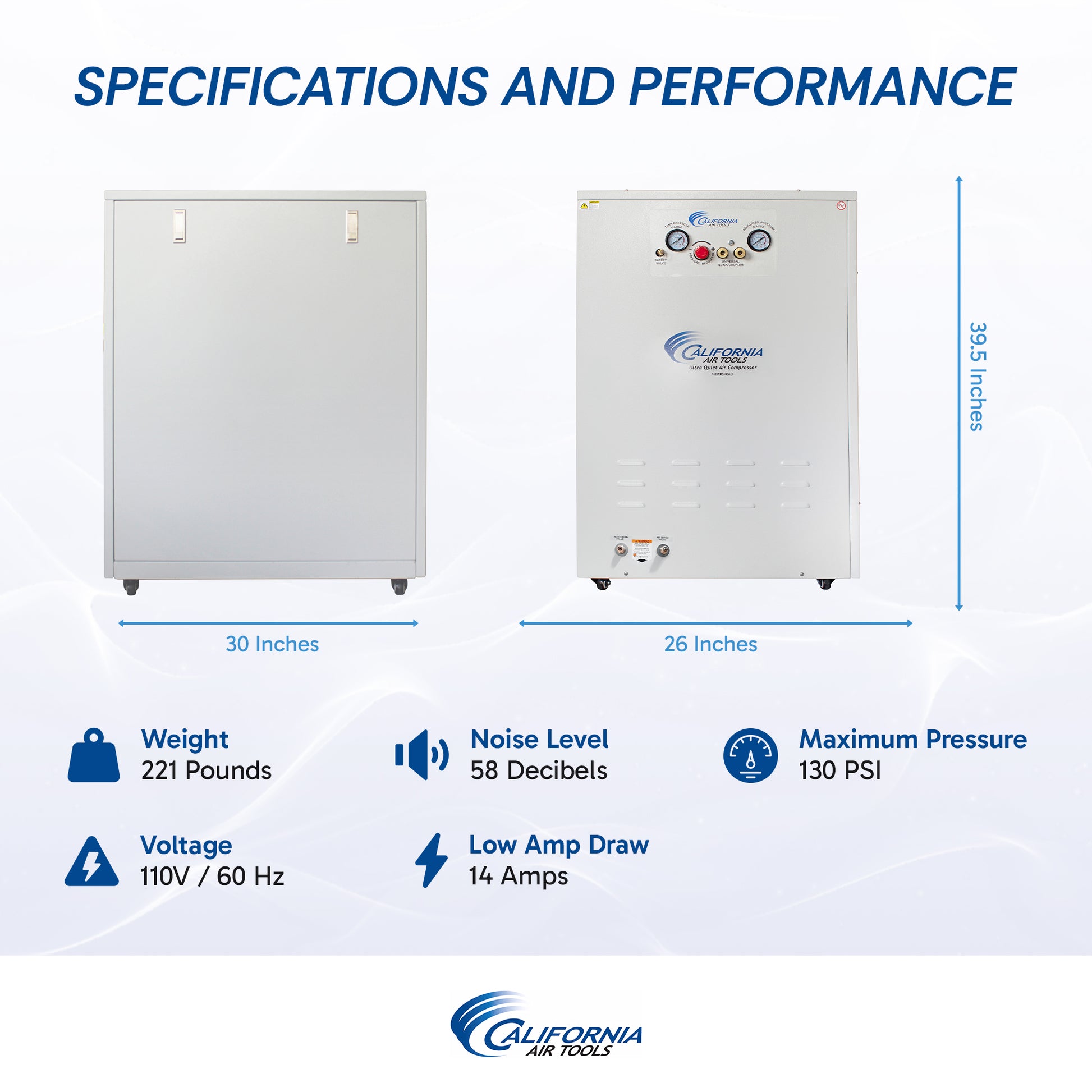 The California Air Tools 10020DSPCAD operates quietly at just 58 decibels, ideal for indoor environments such as offices, homes, and workshops. Its 2.0 HP oil-free motor runs at only 1680 RPM, ensuring reduced noise, less vibration, and enhanced durability.