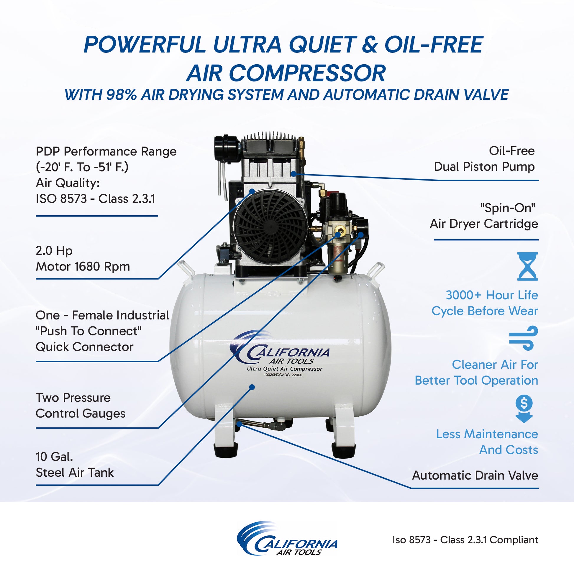 California Air Tools 2.0 Hp, 10.0 Gal. Steel Tank Ultra Quiet & Oil-Free Air Compressor with Air Drying System 220v 60hz