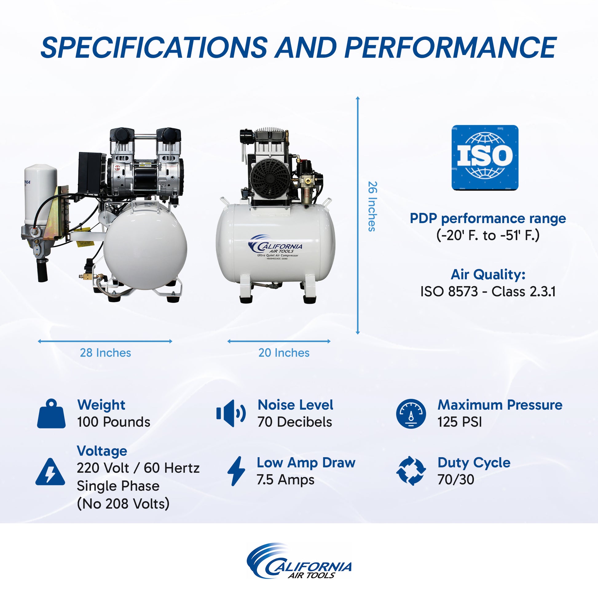The California Air Tools 10020HDCADC-22060 delivers ultra-quiet, powerful performance (70 dB) ideal for labs, workshops, and offices. Its efficient 2.0 HP, 220V motor operates at 1680 RPM, minimizing noise and wear.
