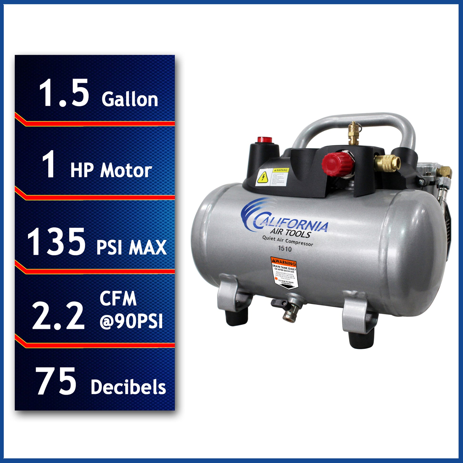 The California Air Tools 1510 Quiet Air Compressor is perfect for small businesses and home projects. Its lightweight, portable design (30 lbs) and ultra-efficient, oil-free dual piston pump make it easy to use anywhere.