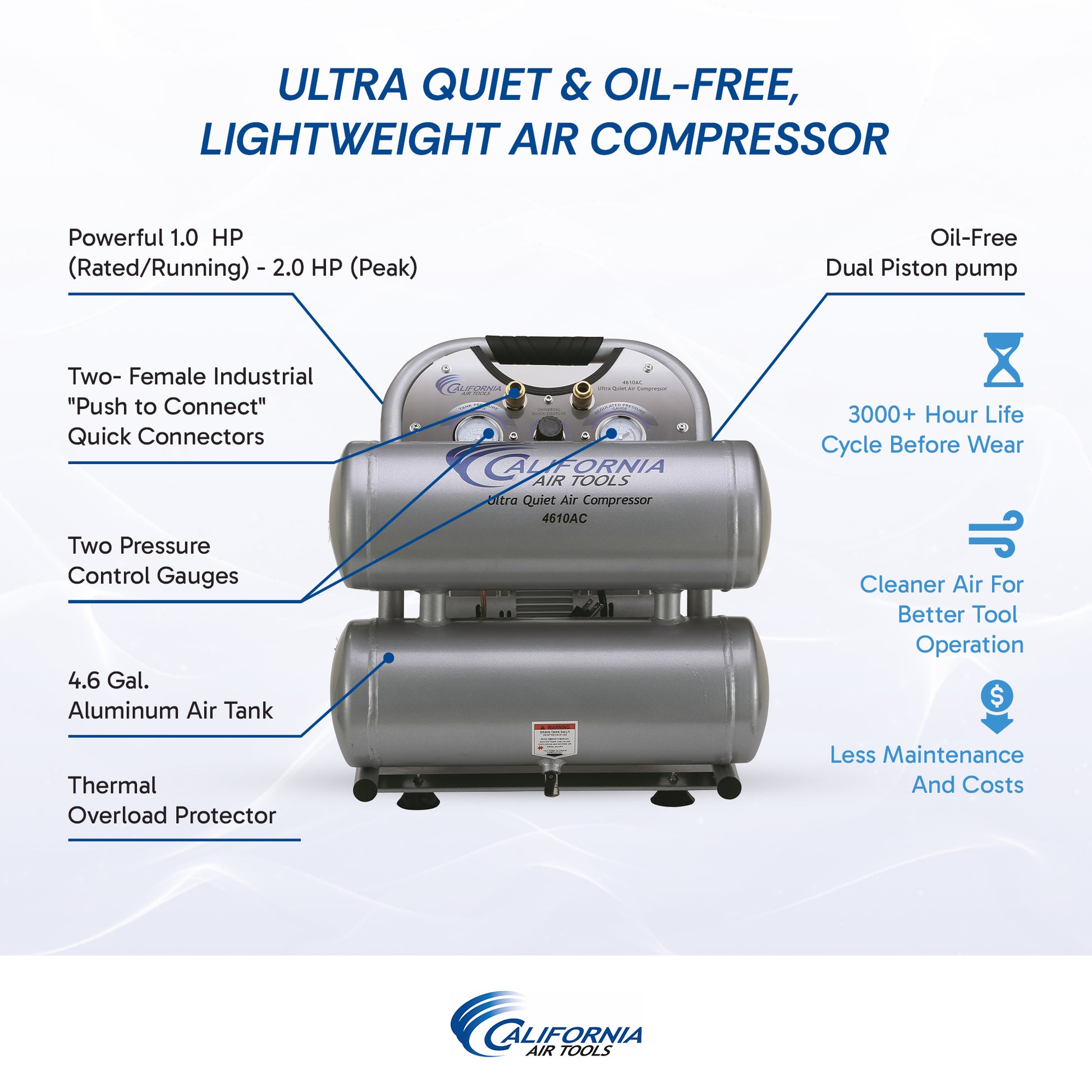 The California Air Tools 4610AC Ultra Quiet & Oil-Free Portable Air Compressor is designed for ultra-quiet operation at just 60 decibels. Its powerful 1.0 HP motor runs smoothly at 1680 RPM, significantly reducing noise, vibration, and wear. The Oil-Free Dual Piston Pump System provides exceptional durability and a lifespan of over 3,000 hours, outperforming similar compressors.