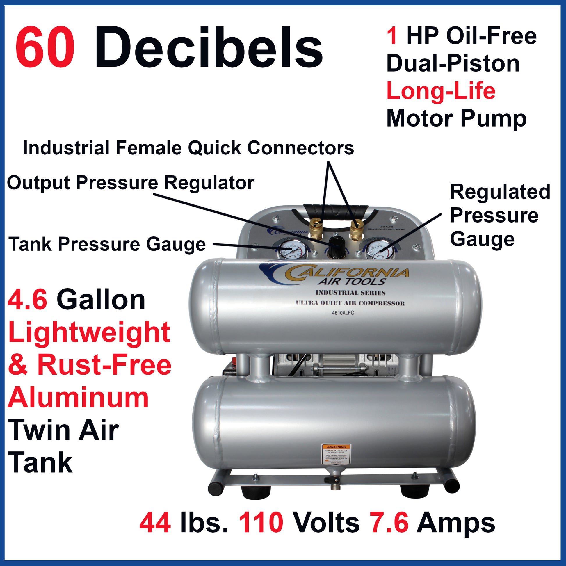 California Air Tools 1.0 Hp, 4.6 Gal. Aluminum Twin Tank Ultra Quiet & Oil-Free Air Compressor