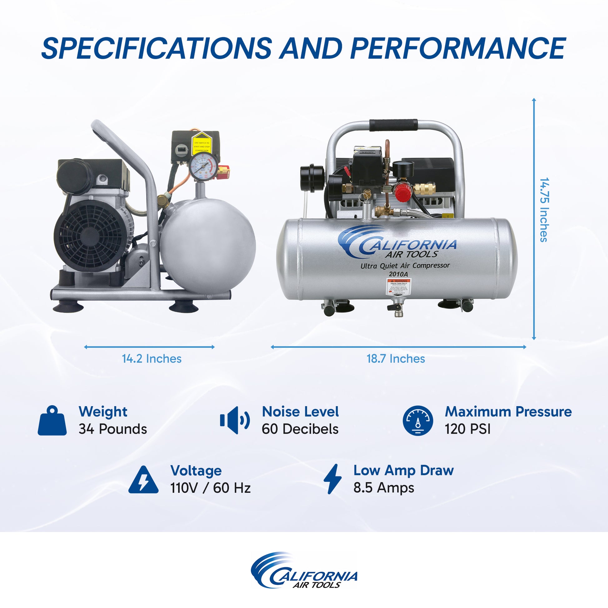 Get reliable performance without the noise using the California Air Tools 2010A Ultra Quiet Air Compressor. At only 60 decibels, it’s perfect for indoor use and noise-sensitive environments.