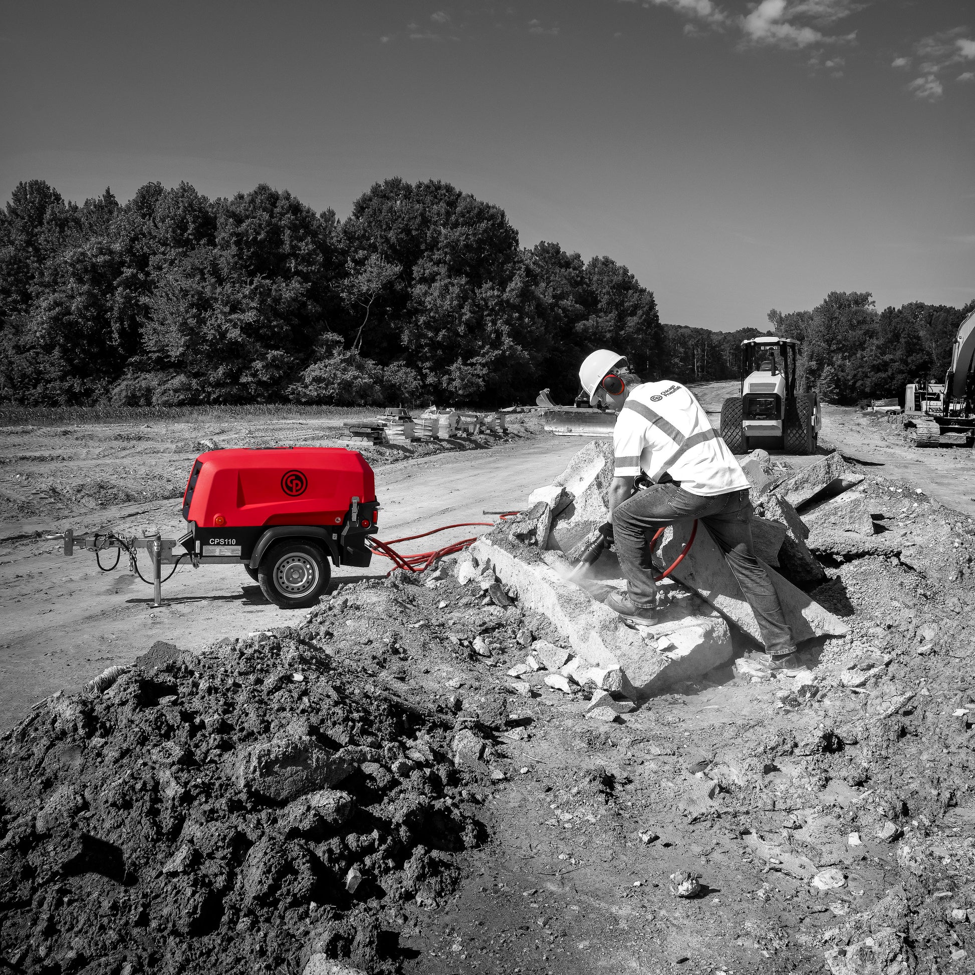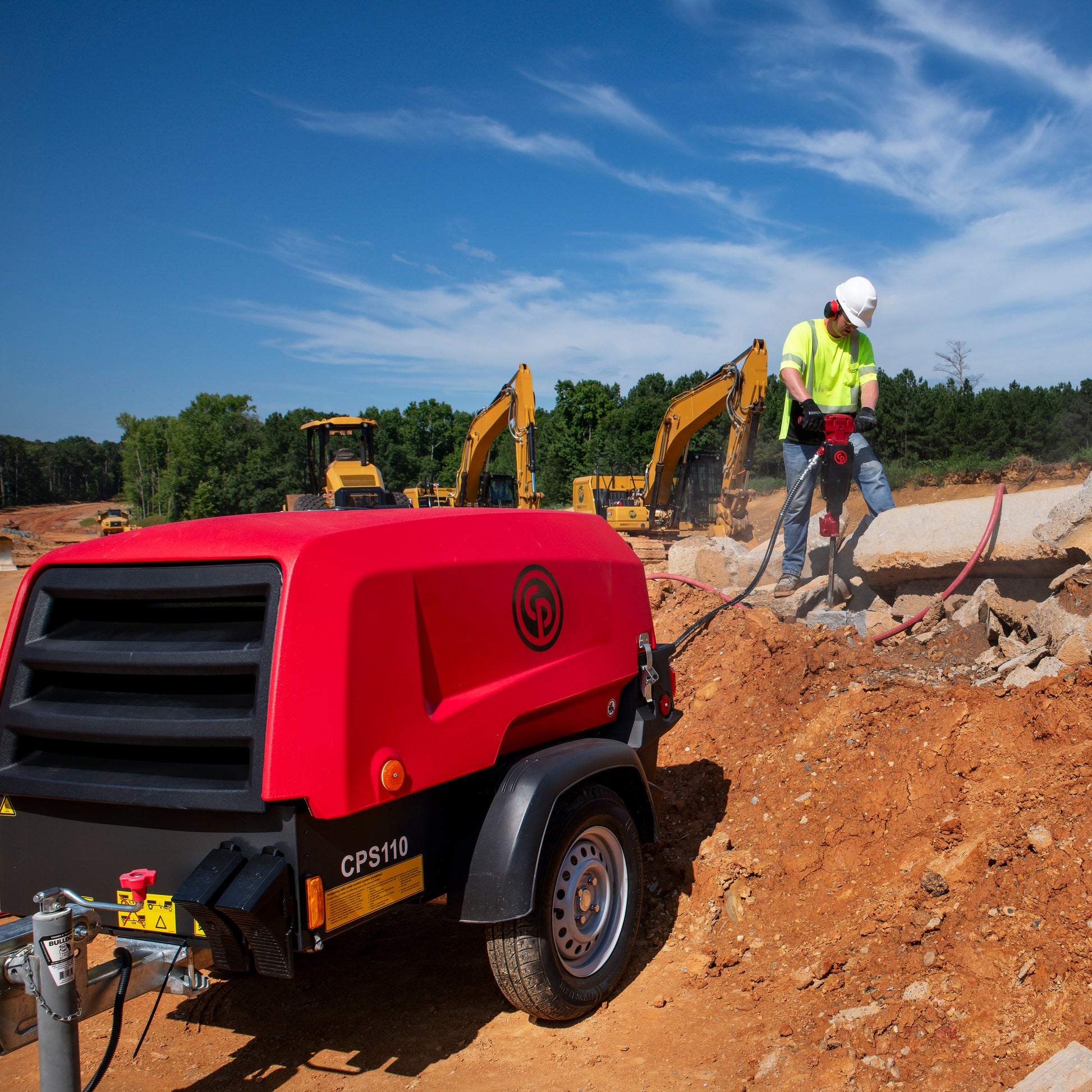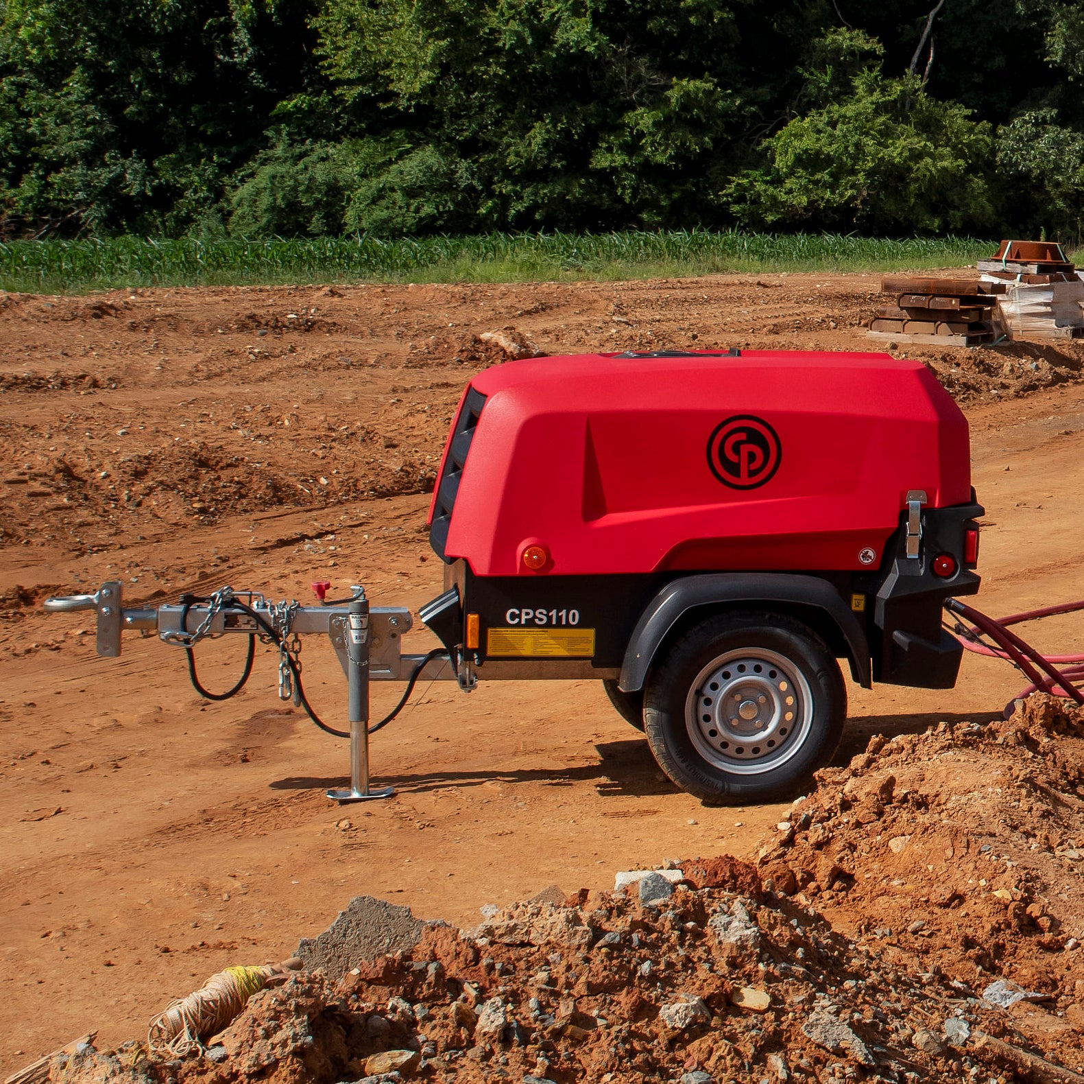 The Chicago Pneumatic CPS 110 is a single-stage, oil-injected, rotary screw type air compressor, powered by a liquid- cooled, three-cylinder turbocharged Kubota diesel engine. The unit hosts the new generation C67 Screw element in its air end combined with a Kubota made diesel engine model D902, complying with Tier 4 Final emission standard. An undercarriage with fixed towbar and pintle eye is available as standard, combined with Department of Transportation approved road lighting. Special attention has been given to the overall product quality, user friendliness, ease of serviceability, and economical operation to ensure best in class cost of ownership.