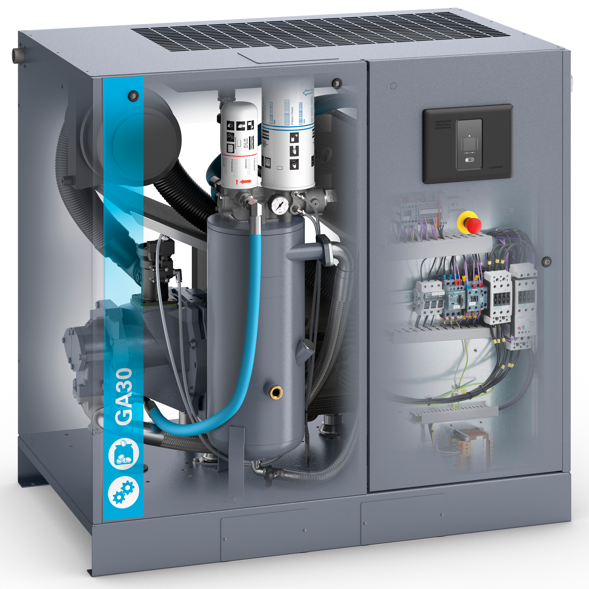 - Note: GA30 is commonly offered in floor-mounted versions (not tank-mounted), keeping the 40 hp platform optimized for stability and service access.