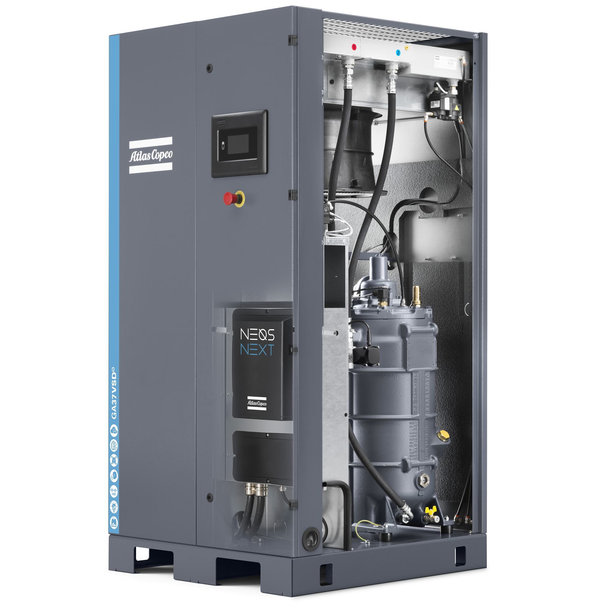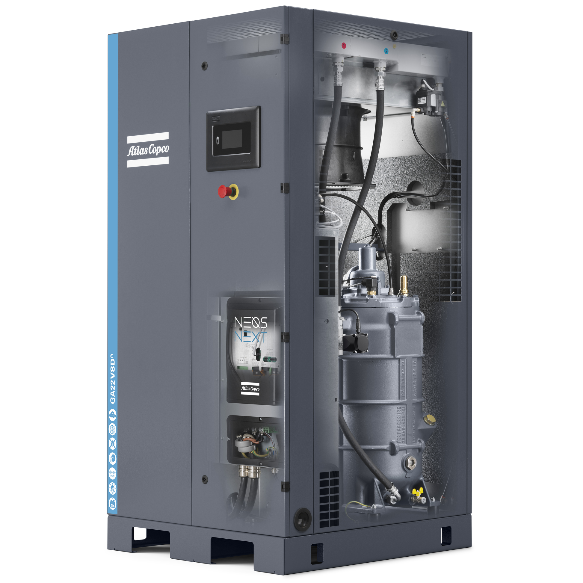The Atlas Copco GA22–37 VSDS rotary screw air compressor series delivers next-gen efficiency, smart protection features, and modern connectivity in a compact, quiet package—built to lower operating cost and keep production moving.