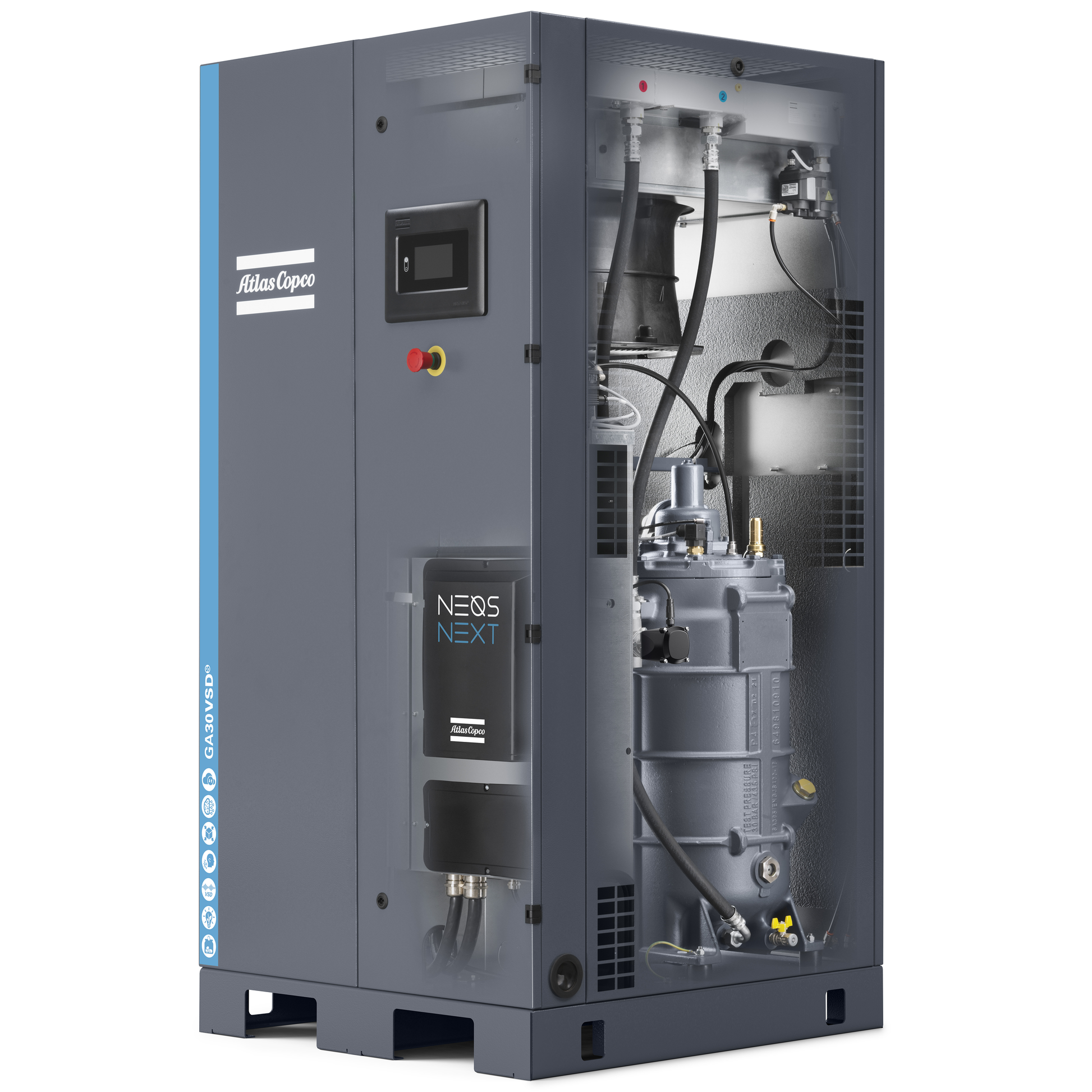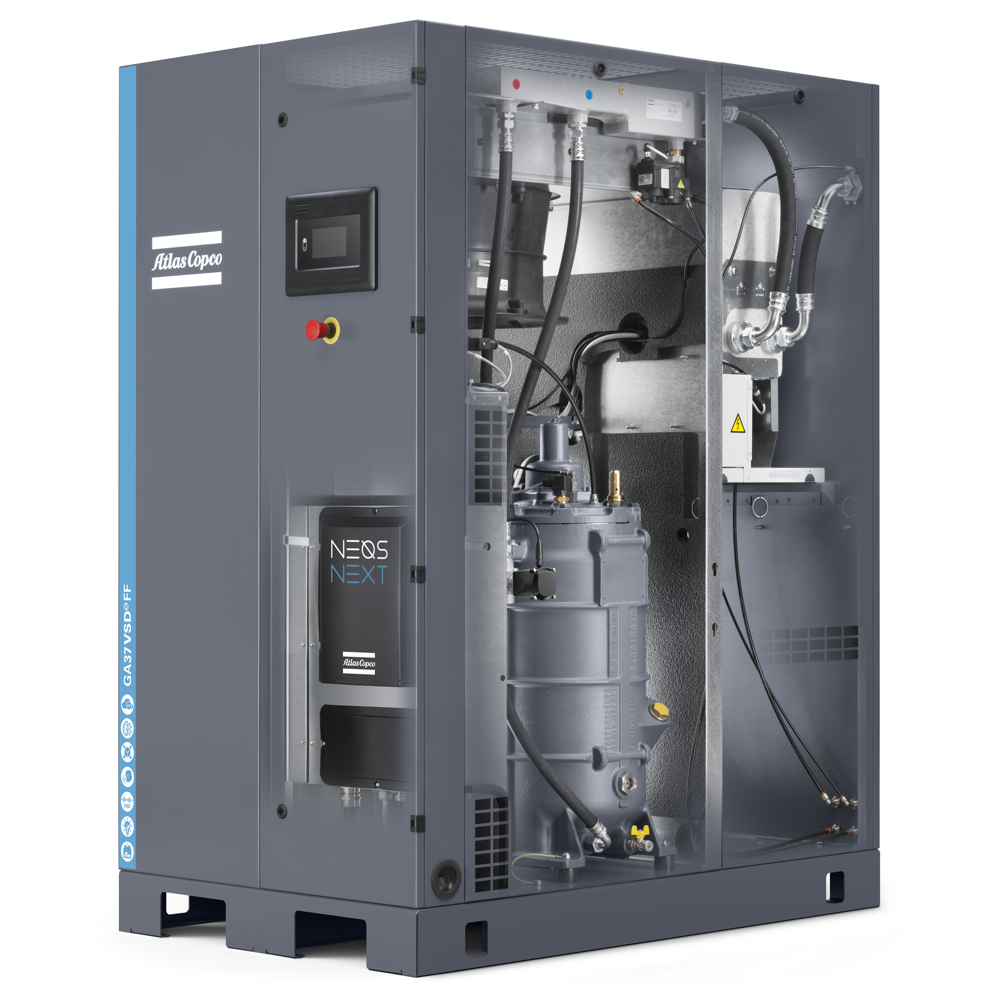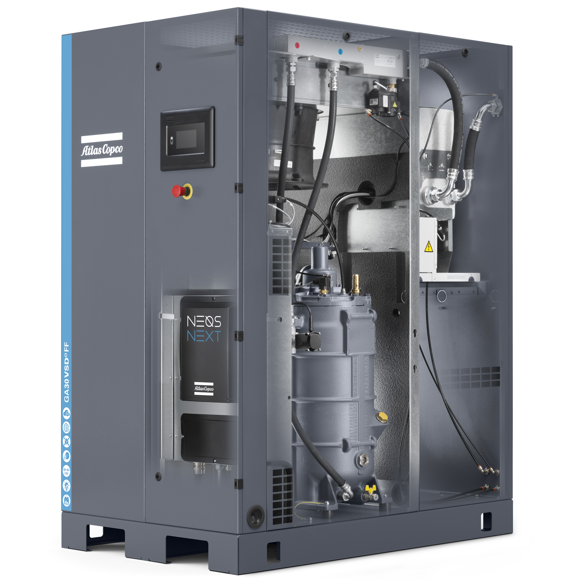 At the core of the GA VSDS platform is Atlas Copco’s Ferrite-Assisted Synchronous Reluctance (FASR) motor—engineered to meet IE5 efficiency and built without rare-earth materials. Speed control is handled by the Neos Next inverter, an IP54-protected compact drive that combines the functionality of an electrical cubicle into one integrated unit.