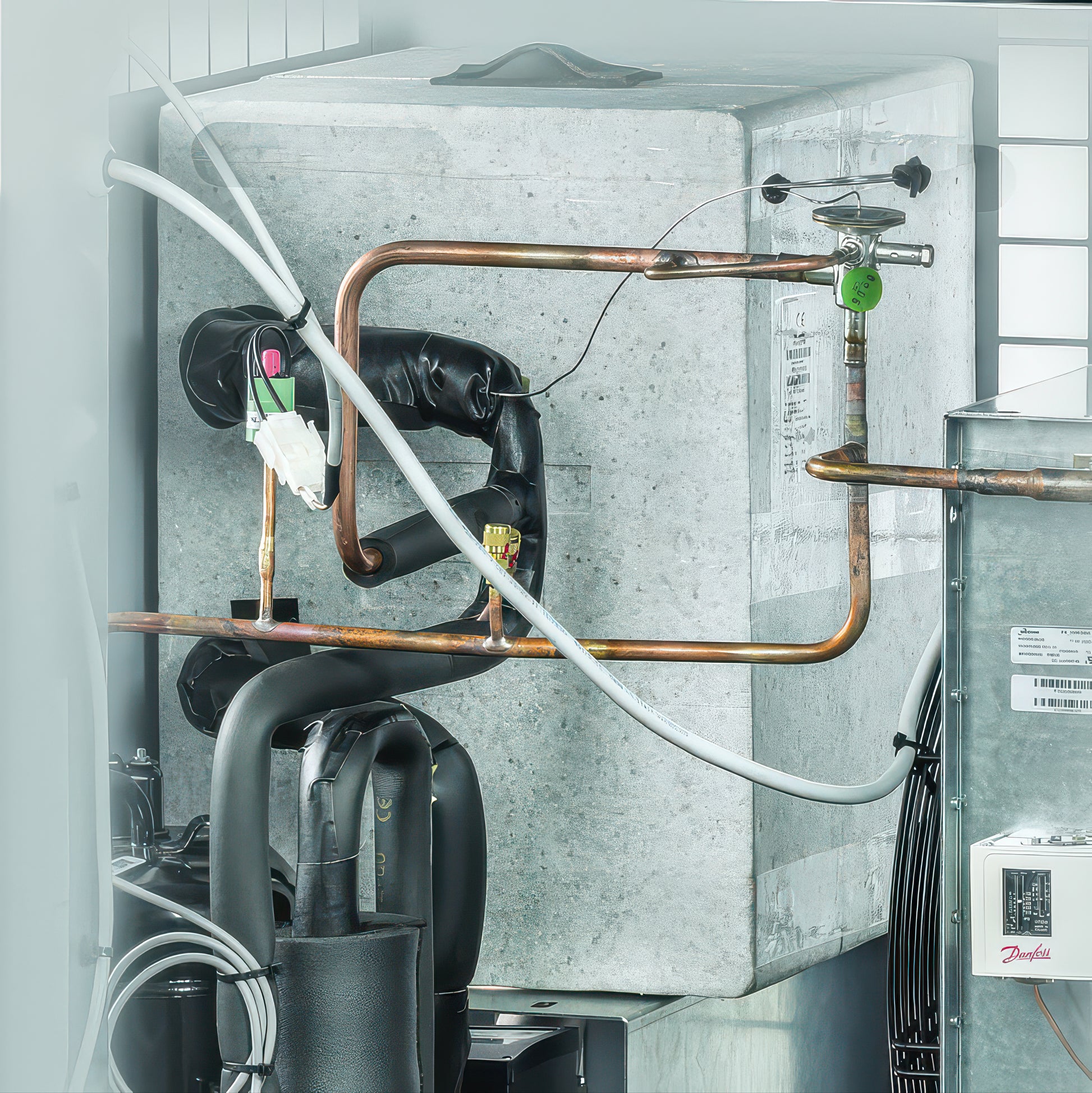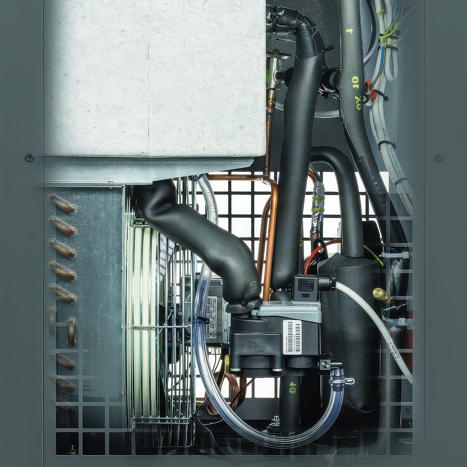How it works (3-in-1 heat exchanger): Hot, wet air is pre-cooled by the exiting dry air, chilled in the air-to-refrigerant evaporator to condense vapor, separated in the integrated moisture separator, then reheated to prevent downstream pipe sweat. A capillary tube (no moving parts) meters refrigerant for reliability, while a hot gas bypass maintains the optimal evaporator temperature to avoid ice.