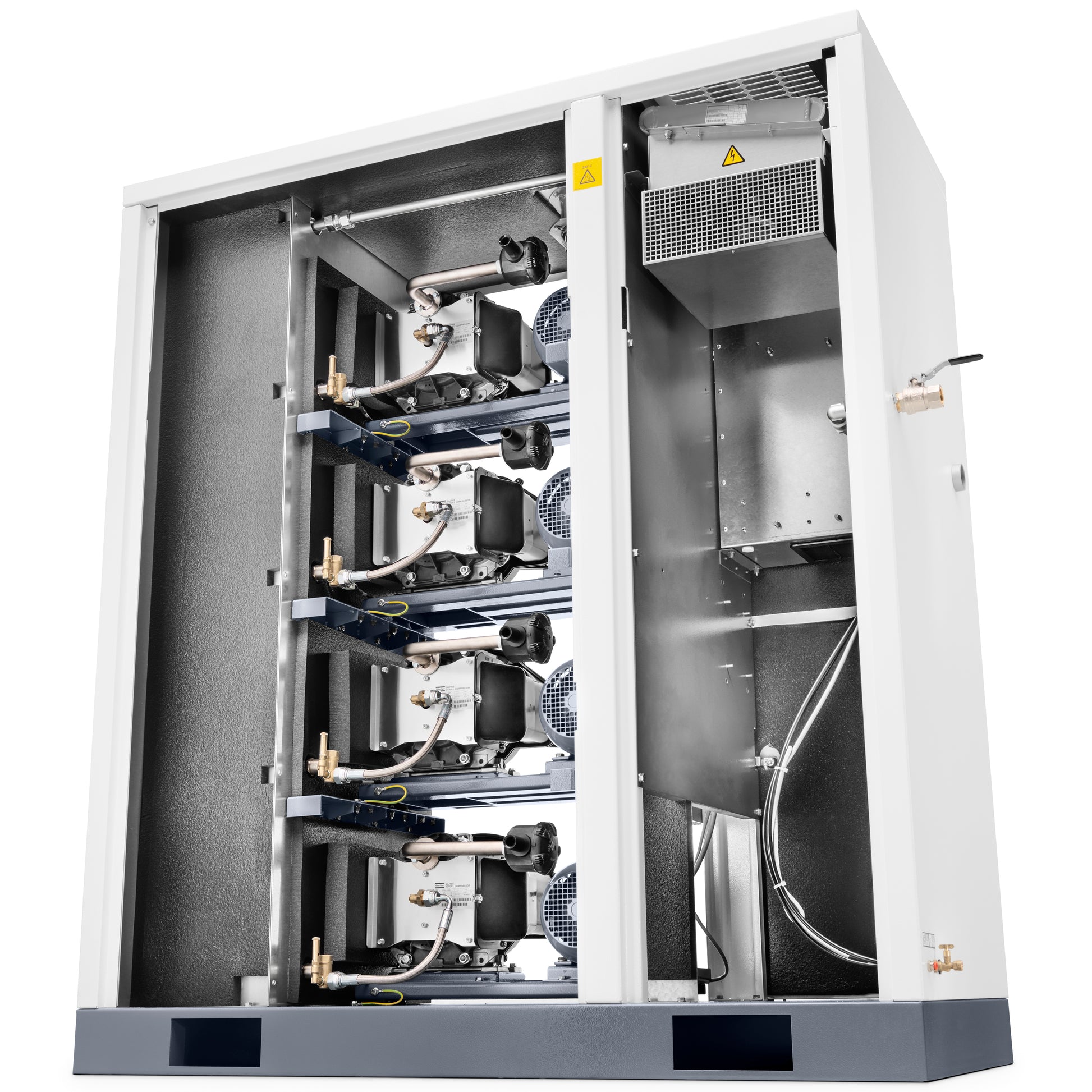 The QOF 10-30 units are equipped with multiple scroll modules. The units utilize Variable Air Delivery technology which controls the requested number of modules depending on your air demand. This technology allows the QOF 10-30 to be able to adjust to demand fluctuations. The intelligent controller prevents simultaneous start of the modules and ensures a very narrow pressure band is maintained. This optimizes the efficiency of the compressor and guarantees a very stable system pressure.
