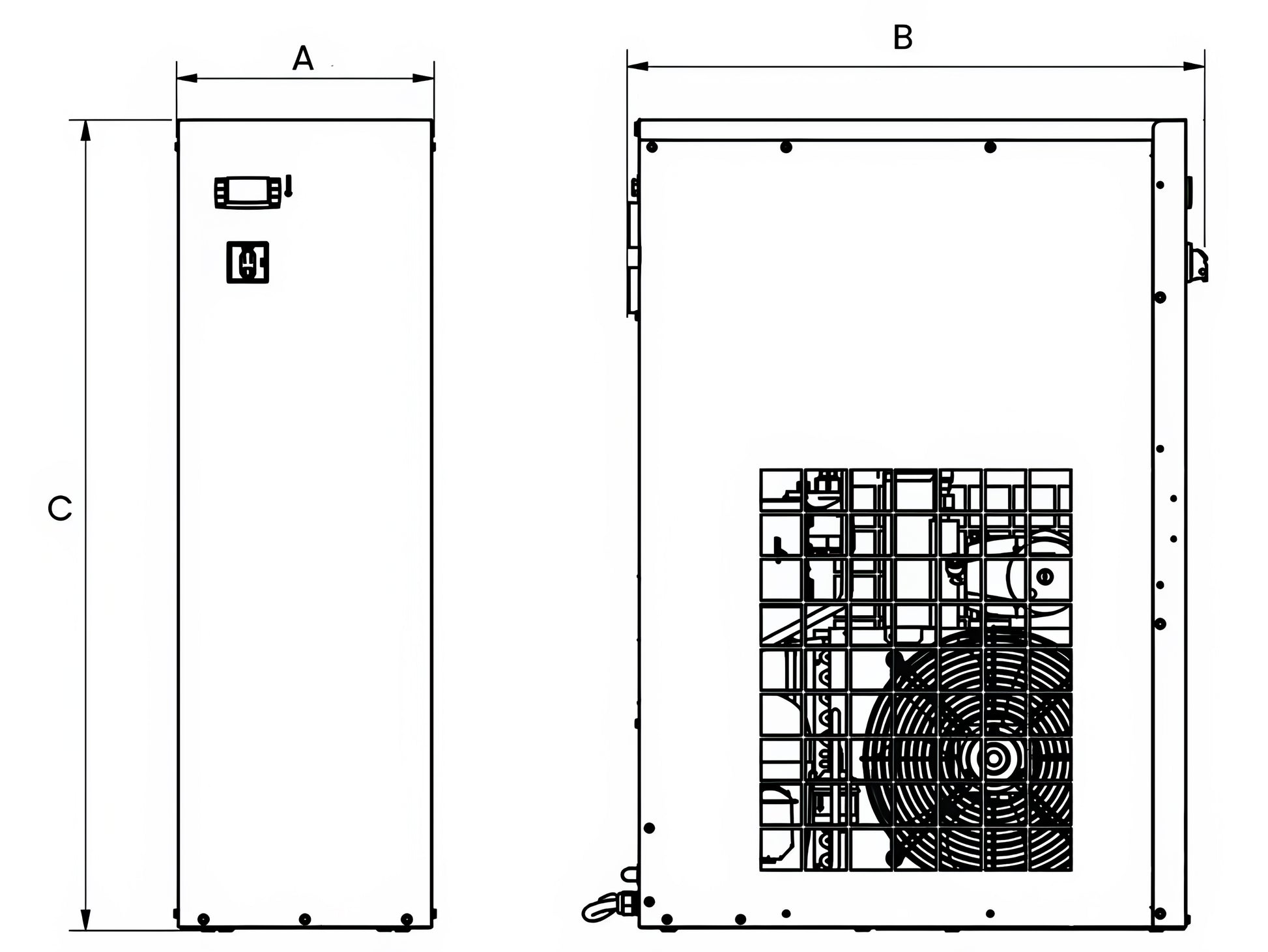 - Controls & components: Dixell™ controller, microchannel condenser, rotary piston compressors, NED zero air loss drain, integrated moisture separation