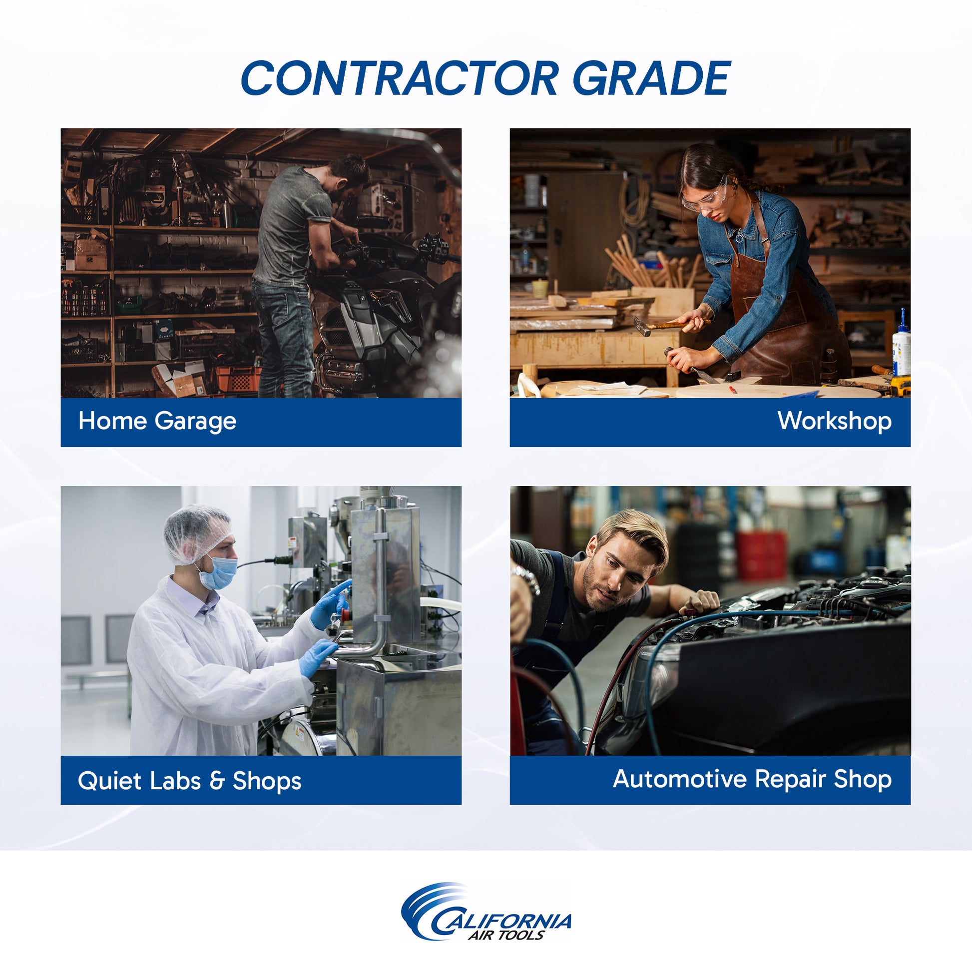 The California Air Tools 8010SPCAD delivers ultra-quiet performance at only 40 dB, ideal for homes, offices, and workshops. Its 1.0 HP oil-free motor runs at just 1400 RPM, ensuring quiet operation and extended durability.