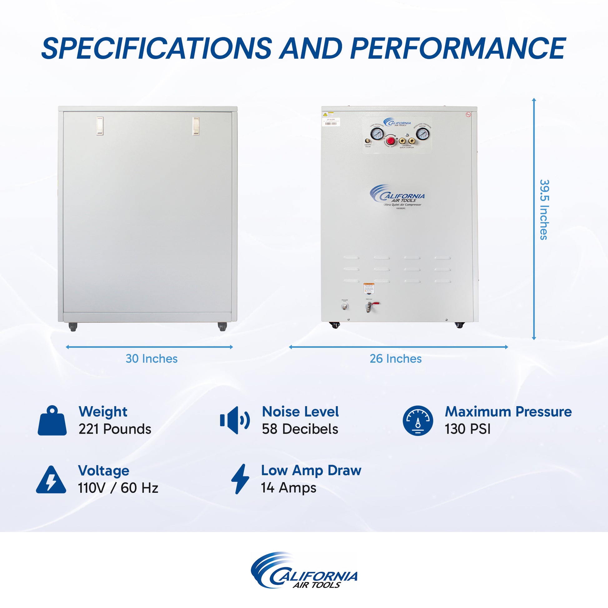 The California Air Tools 10020DSPC delivers ultra-quiet performance at just 58 decibels, perfect for home, shop, office, or warehouse use. Its powerful 2.0 HP oil-free motor operates at 1680 RPM, minimizing noise, vibration, and wear, for extended reliability.
