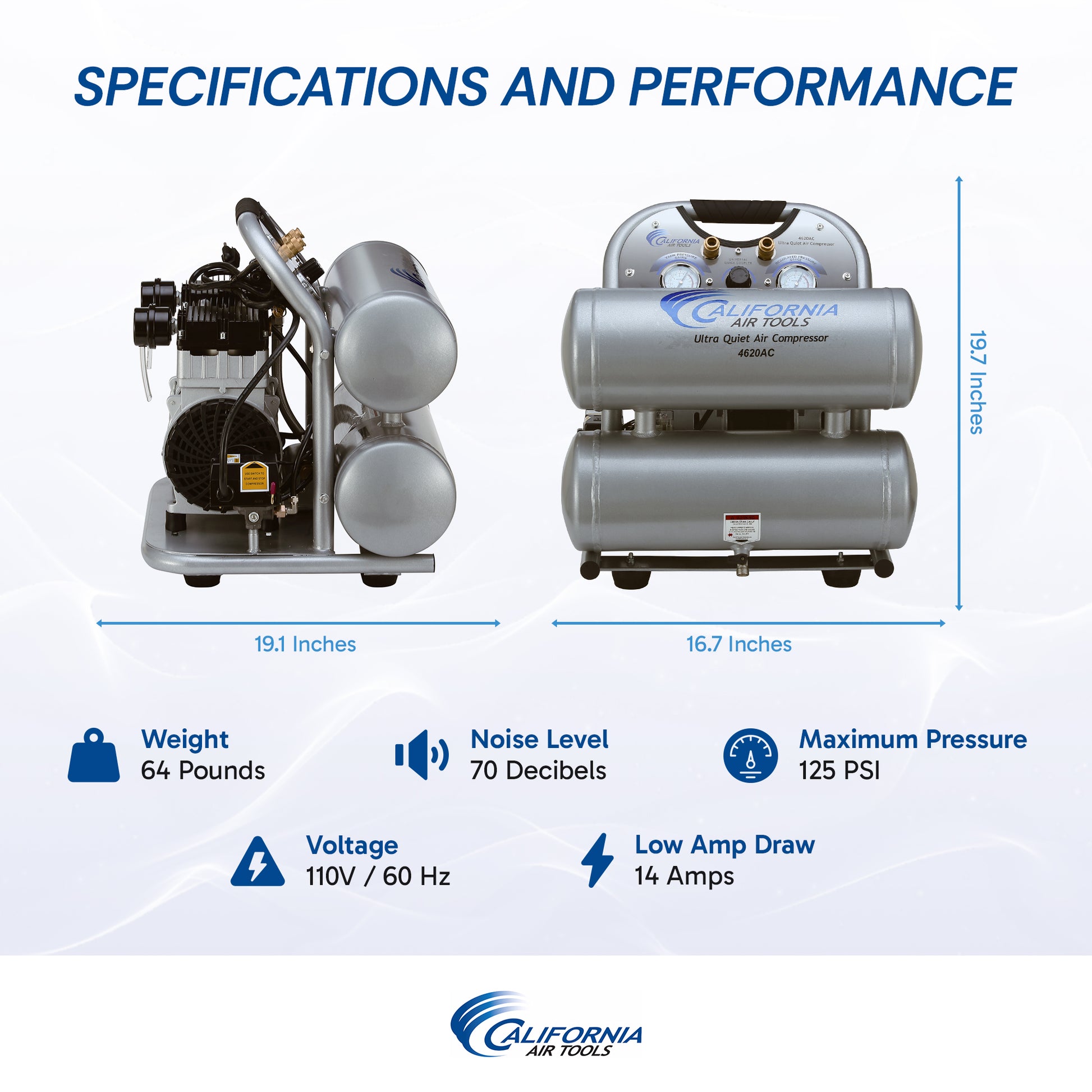 The California Air Tools 4620AC delivers powerful performance with minimal noise (70 dB)—ideal for indoor use, job sites, or areas where noise matters.