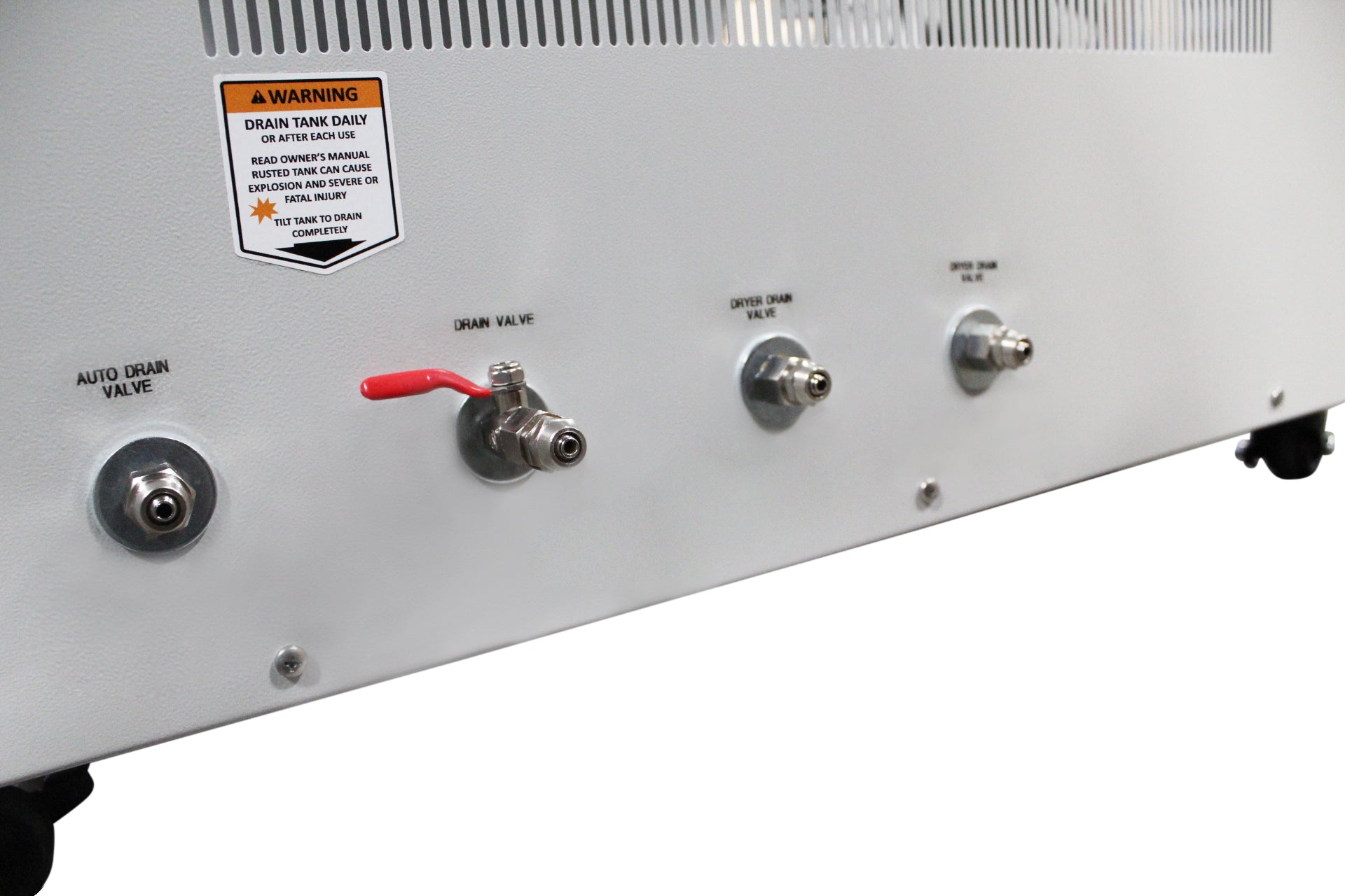 Built inside a sturdy soundproof steel cabinet with acoustic foam insulation, it features easy-access doors, smooth caster wheels for mobility, and four exhaust fans for efficient cooling. Its integrated Aftercooler and Air Dryer remove moisture, protecting your sensitive tools and equipment. The factory-installed EZ-1 Automatic Drain Valve eliminates manual draining with customizable timing.