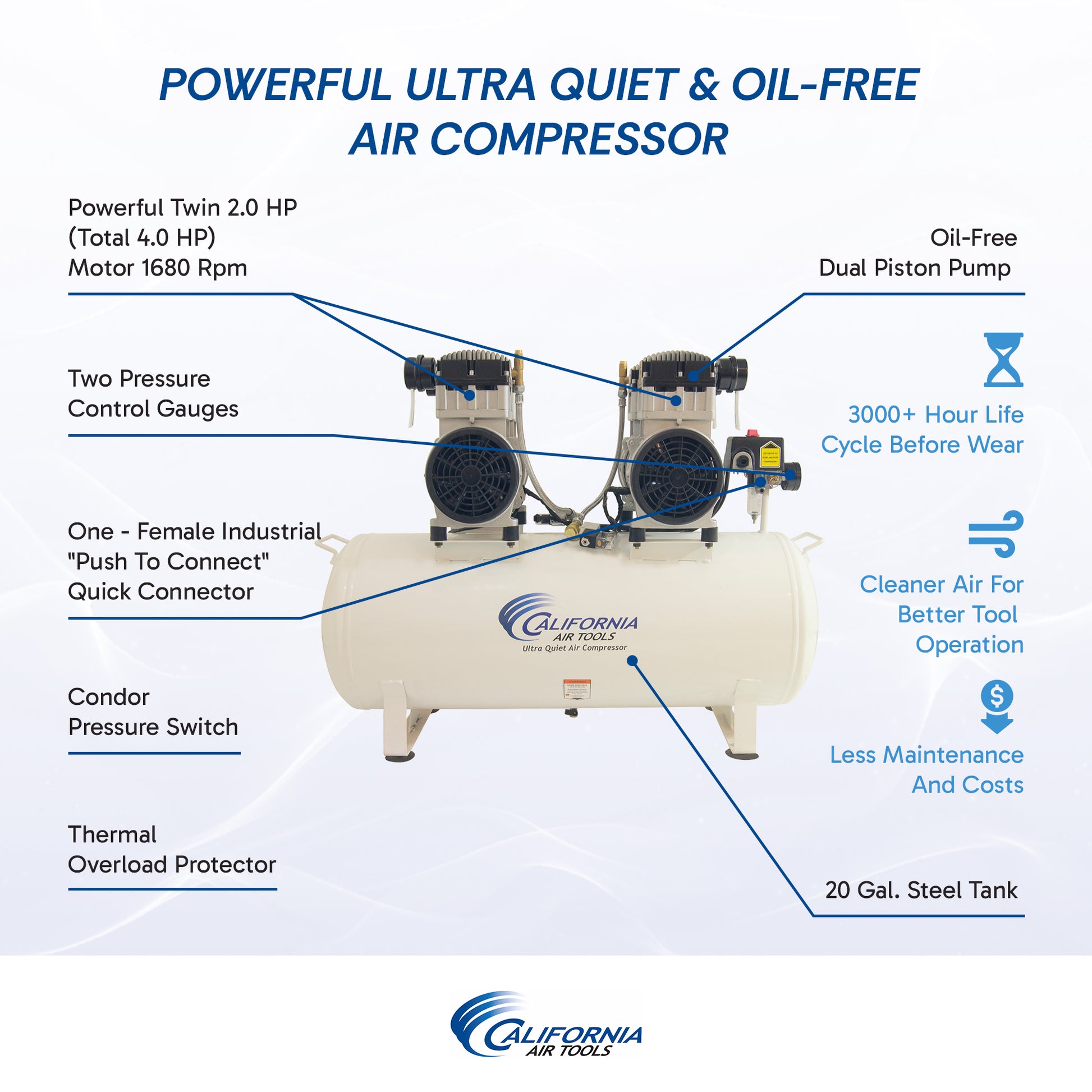 California Air Tools 4.0 Hp, 20.0 Gal. Steel Tank Ultra Quiet & Oil-Free Air Compressor