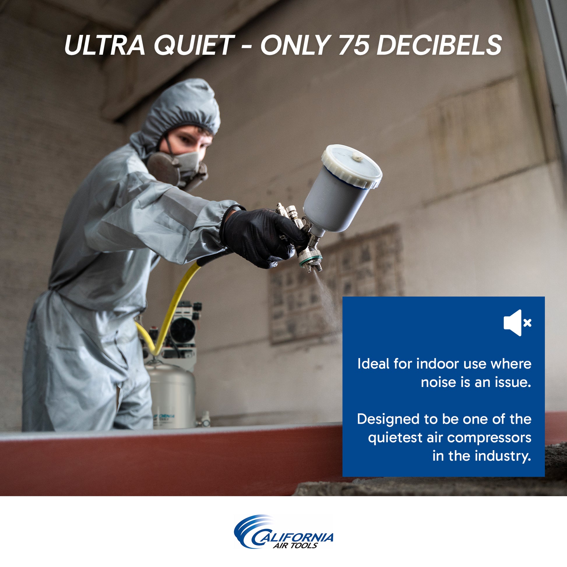 The California Air Tools 60040CAD provides ultra-quiet operation (75 dB) and powerful performance (10.60 CFM @ 90 PSI and 12.80 CFM @ 40 PSI ). Equipped with two efficient 2.0 HP motors running at just 1680 RPM, it significantly reduces noise, vibration, and wear.